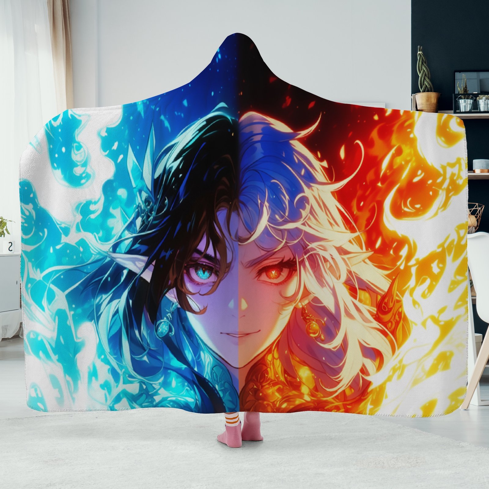 Embrace the duality of the elven spirit with this mesmerizing hoodie blanket, perfect for anyone who enjoys the complexity of fantasy and the warmth of a cozy, high-quality garment.