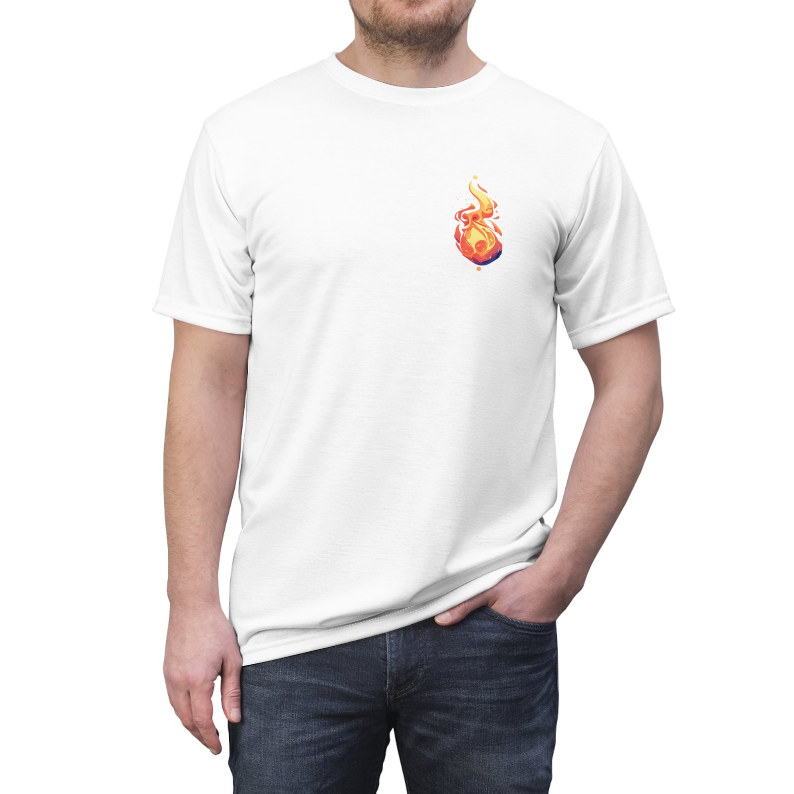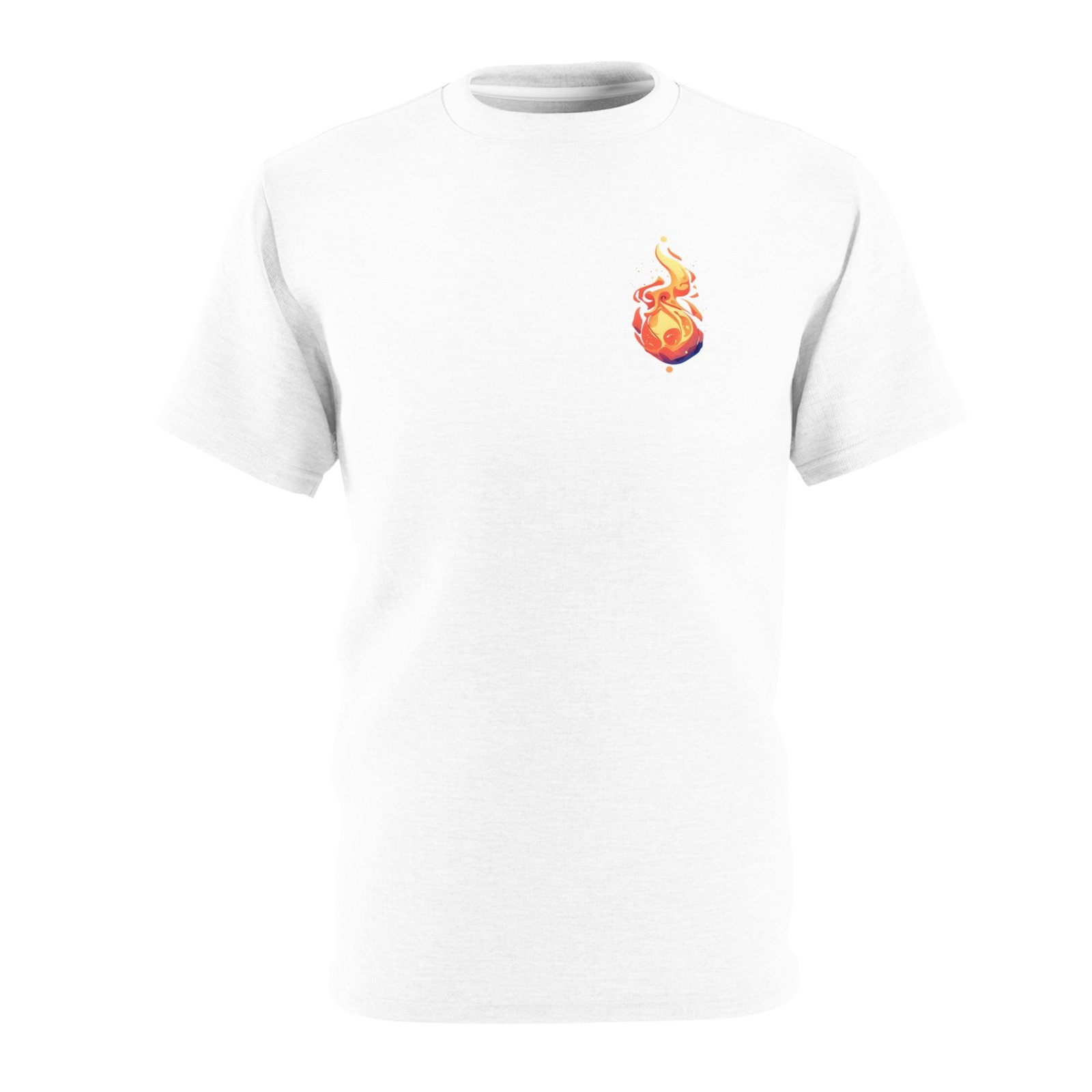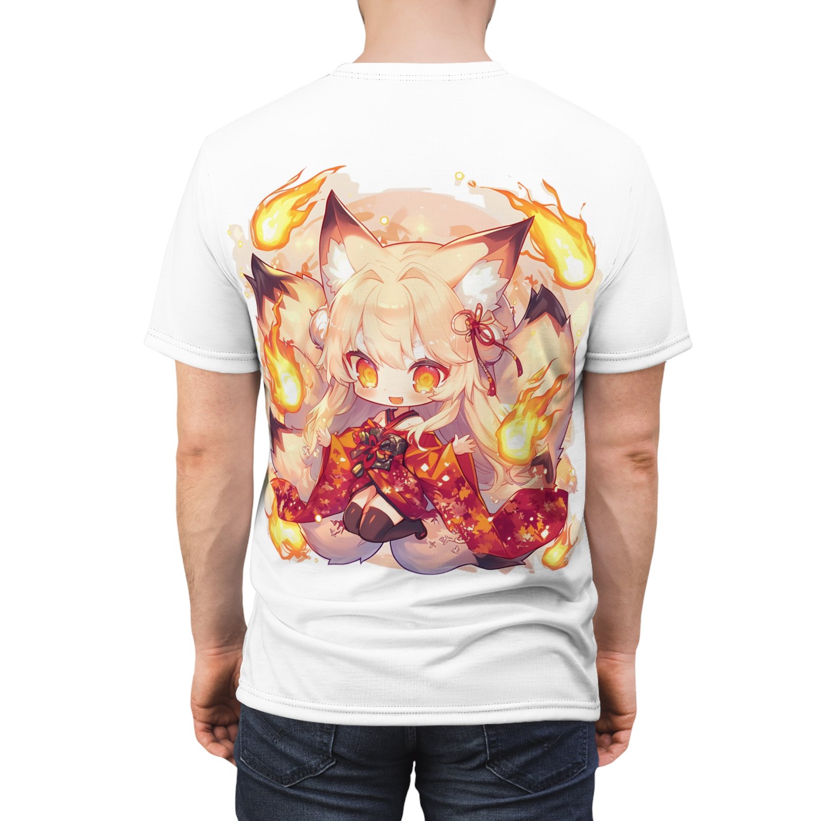 A playful and vibrant tee featuring a chibi kitsune surrounded by fiery magical flames in a hyper-detailed anime style. This tee is perfect for anime fans and those who love unique, eye-catching designs. Ideal for casual wear or as a statement piece for anime conventions or cosplay events.