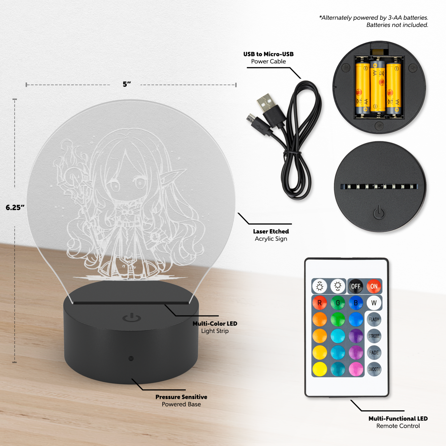 Step into the enchanting world with our Chibi Elf Mage LED Sign! This adorable chibi elf mage is laser-etched into acrylic and brought to life with vibrant LED colors. With a simple remote, you can easily control the ambiance—choose from 16 colors, add some flash or strobe effects, or smoothly transition between shades. The brightness can be adjusted to match your mood, making this LED sign the perfect magical touch to any room. Whether you’re a fan of fantasy or just looking for a whimsical centerpiece, this sign is sure to cast a spell on anyone who sees it!