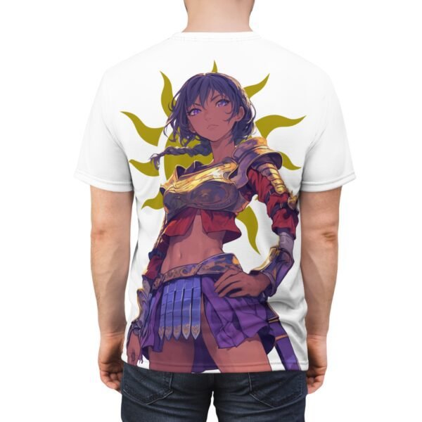 A stylish unisex tee featuring a design of a woman gladiator with black hair in anime style. This tee gives off a strong and adventurous vibe, perfect for anime fans and those who appreciate unique designs. Ideal for casual wear or to make a statement at an anime convention or themed event.